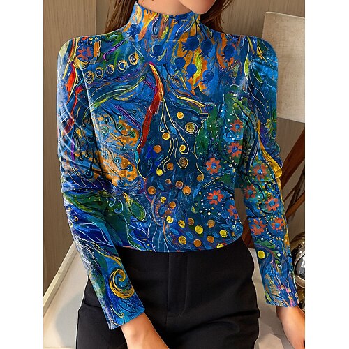 Per donna Tunica Maglietta Floreale Grafico Elegante Vintage Moda Manica Lunga Collo Alto Top corti Quotidiano Uscire Weekend Stampato Giallo Blu marino Azzurro Primavera
