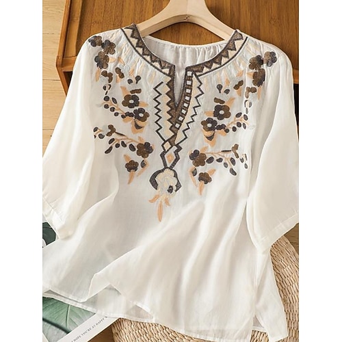 Per donna Blusa Floreale Elegante Casual Manica 3/4 Girocollo Top Regolari Quotidiano Arricciato Ricamato Blu Bianco Rosa Viola Verde Estate Primavera