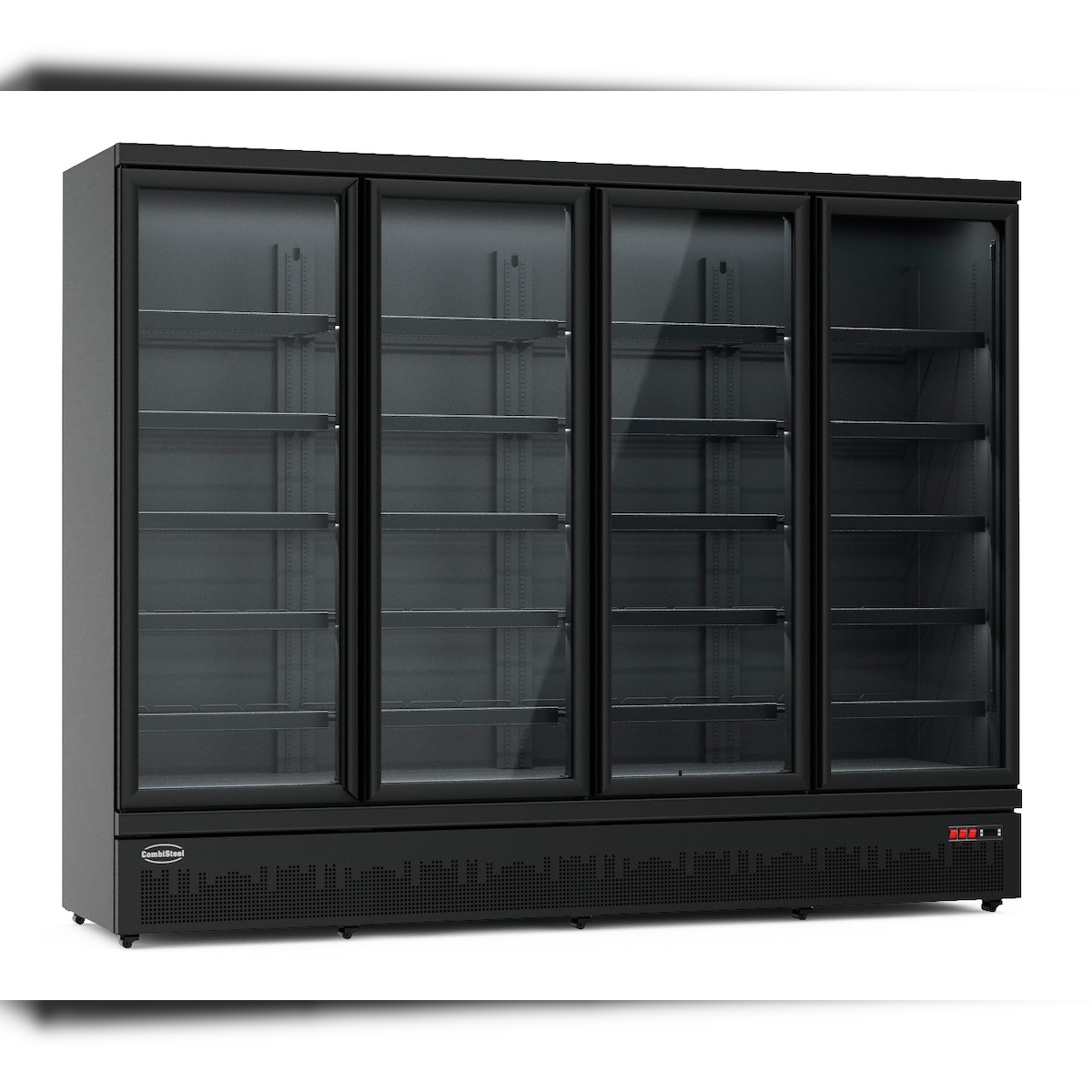 Kühlschrank RHINO auf Rollen | 4x Glastür + LED | 2025 Liter, HxBxT 200,3x250,8x71cm | 0/+10°C | Schwarz + CHEFGASTRO Geschirrtuch