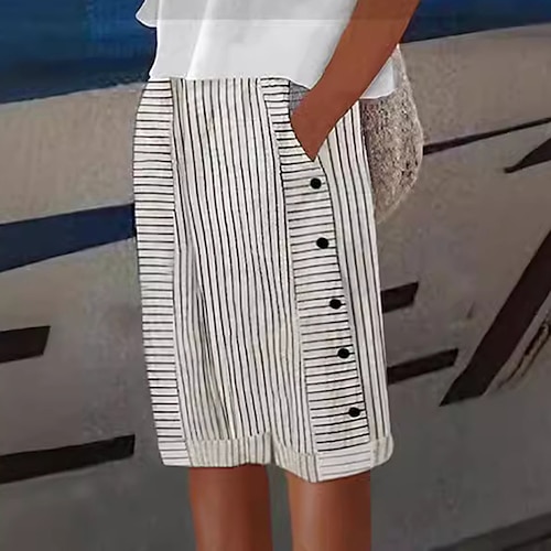 Per donna Finto cotone e lino Shorts Casual Quotidiano Lunghezza al ginocchio A righe Tasche Laterali Traspirabilità Confortevole Inelastico Uscire Weekend Beige Estate Vestibilità regolare