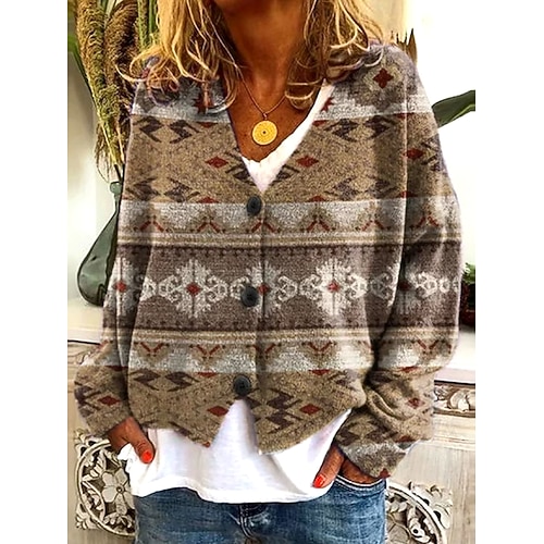 Per donna Felpa Cardigan Elegante Vintage Moda Floreale A righe Rombi Scollo a V Tasca Lavorato a maglia Stampato Manica Lunga Top Regolari Maglia All'aperto Quotidiano Weekend Rosso marrone Marrone
