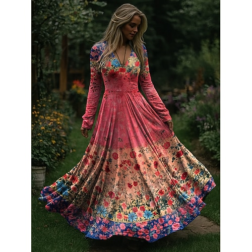 Natale Per donna Abito maxi Abito Pieghettato Festa Casual Boho Quotidiano Data Uscire Vestibilità regolare Floreale Manica Lunga Scollo a V Rosa scuro Primavera Autunno Inverno