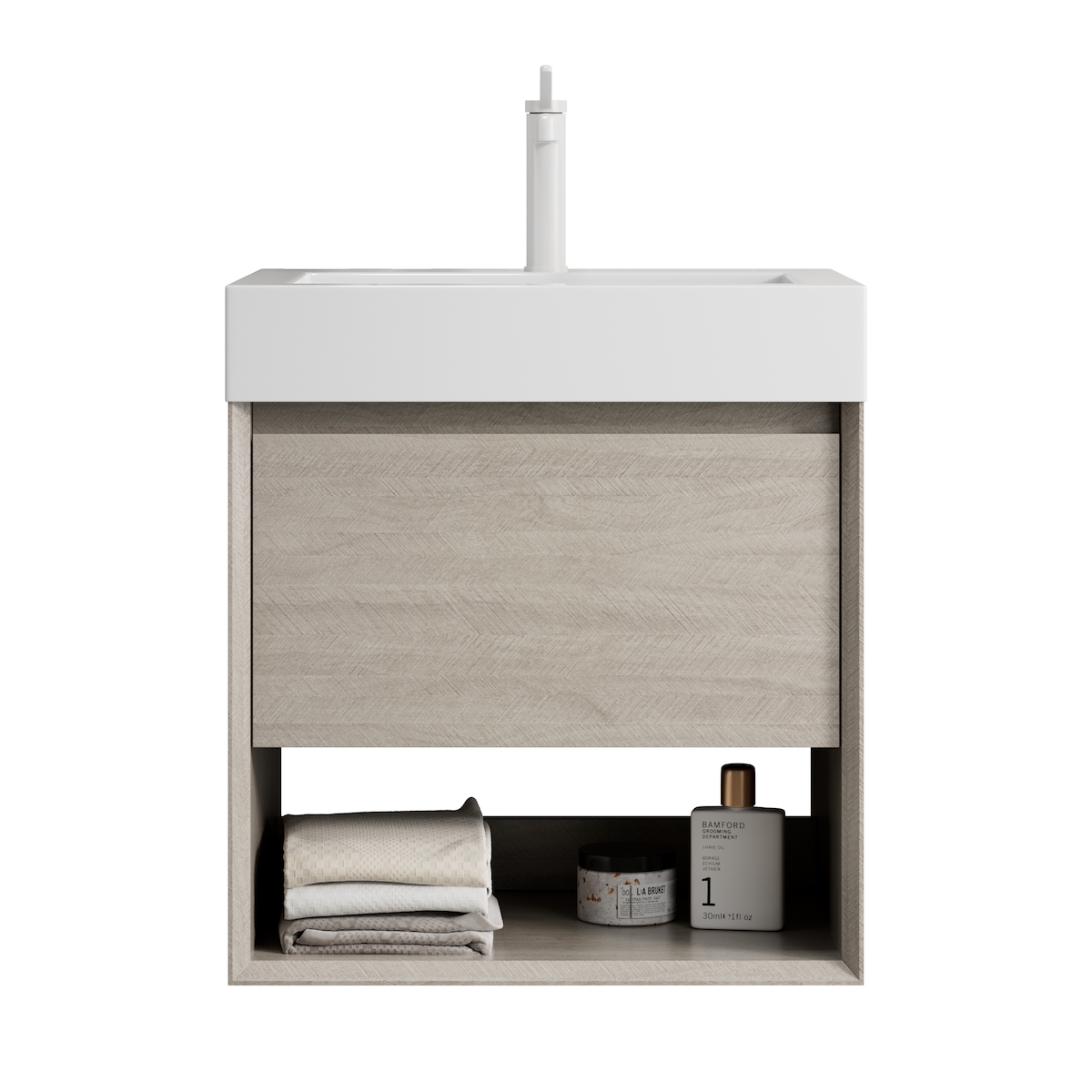 OKWISH Badezimmer-Waschtisch 55x46x60 Resinbecken Schublade Offenes Regal Eiche Hell Modern Sanftschließung Stauraum Weiß