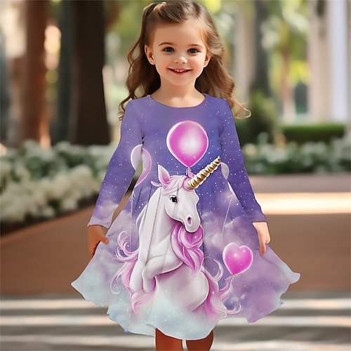 ragazze' 3D Pop art Unicorno Vestito Manica lunga Estate Primavera Da mare Giornaliero Per eventi Da principessa Bellissimo Dolce Bambino 4-12 anni Abito casual Abito linea A Al ginocchio Standard