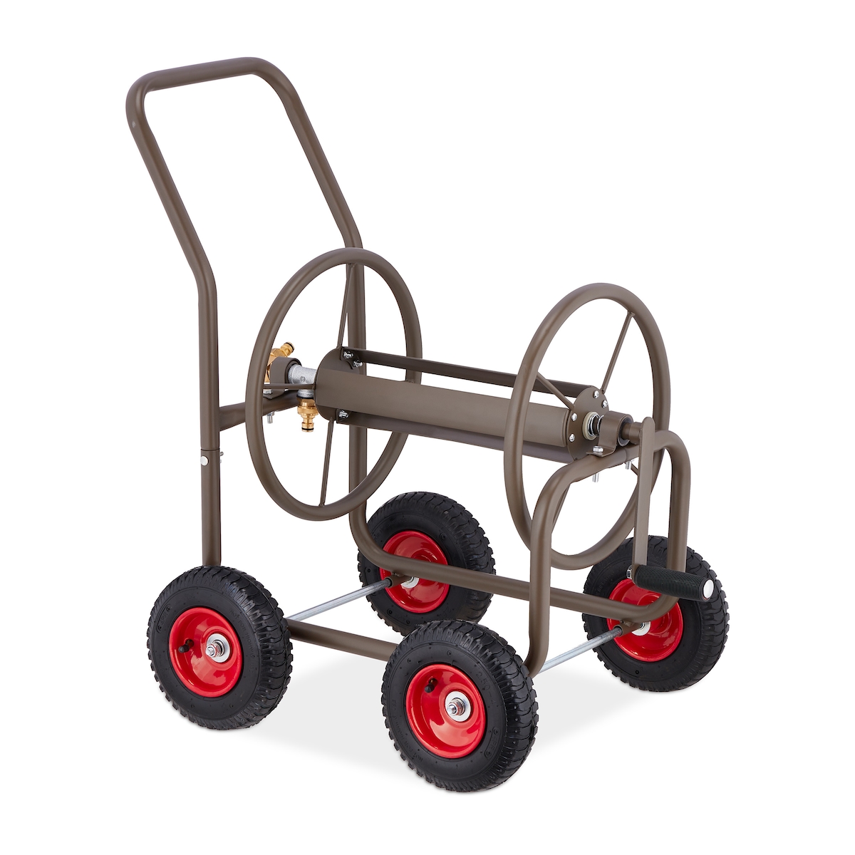 Relaxdays Schlauchwagen, bis 60 m Schlauch, 4 Lufträder, Klickkupplung, Schlauchtrommel Metall, Schlauchabroller, braun