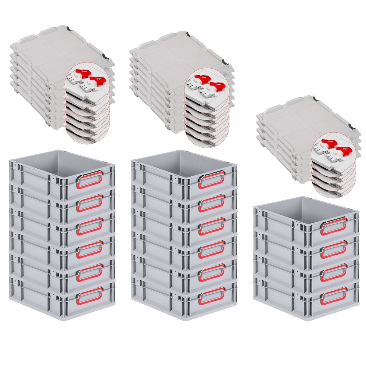 PROREGAL 16x Eurobox NextGen Color mit Scharnierdeckel & Verschlüssen | HxBxT 12x30x40cm | 11 Liter | Griffe rot geschlossen | Glatter Boden