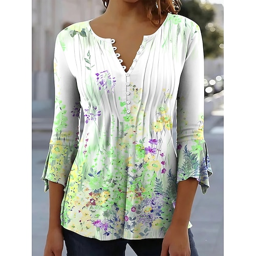 Per donna Blusa Floreale Grafico Elegante Manica 3/4 Scollo a V Top lunghi Quotidiano Uscire Volant Bottoni Blu Giallo Viola Verde Estate Primavera