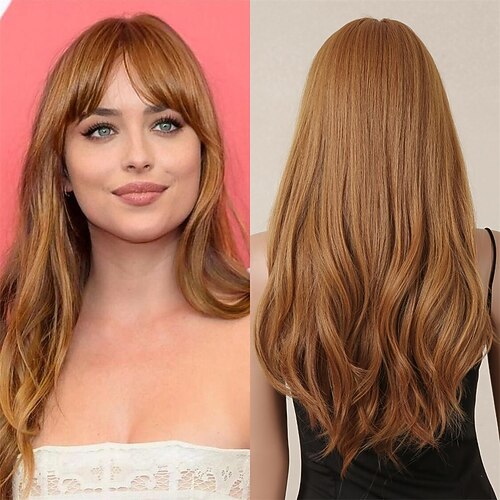 lunghe parrucche ricci marroni per donna, parrucche a onde profonde con frangia, parrucche sintetiche resistenti al calore con riflessi