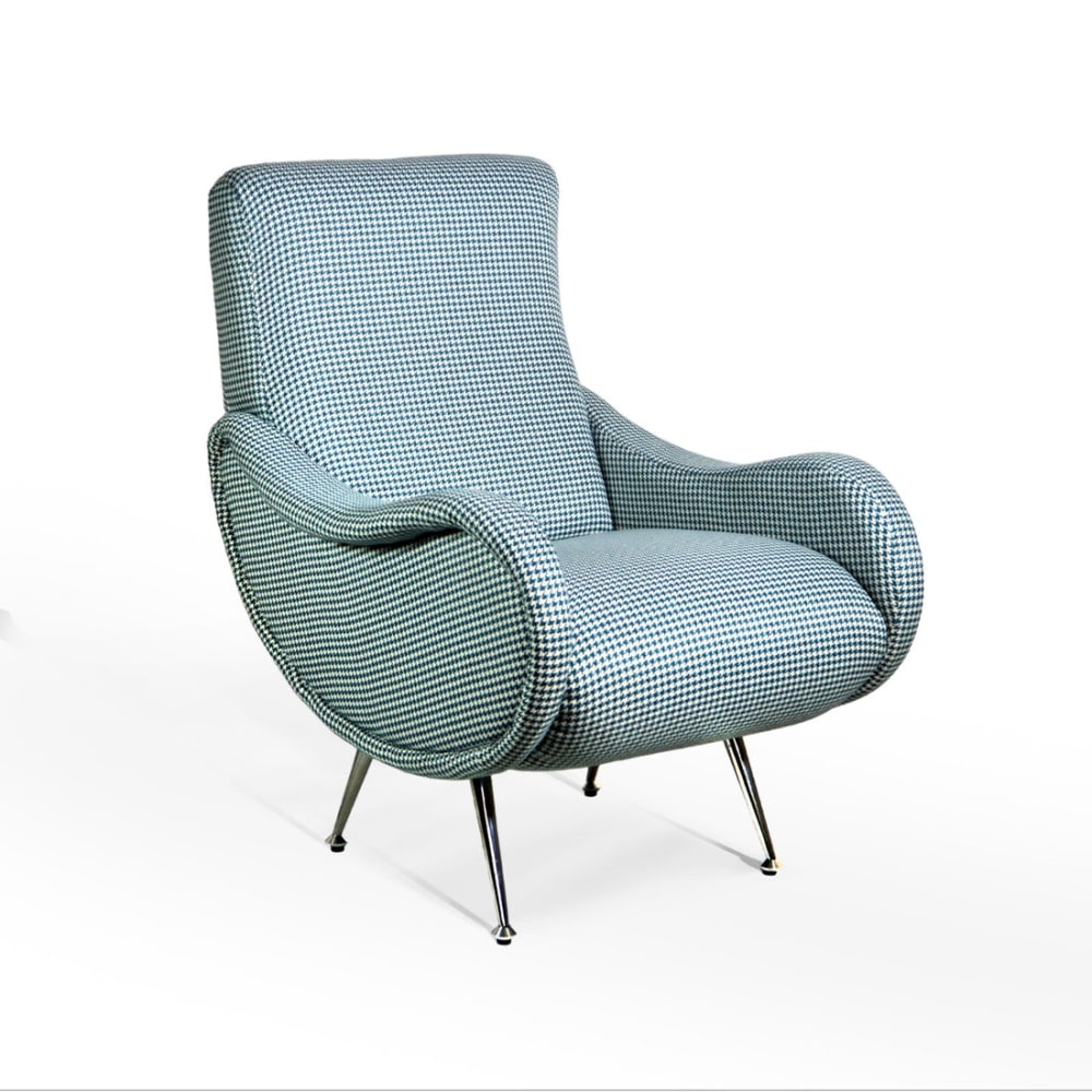 Poltrona design vintage in tessuto pied de poule blu gambe oro