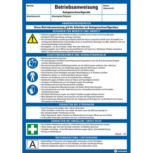 König Werbeanlagen Dreifke® Maschinenbetriebsanweisung Autogenschweißgeräte, Kunststoff, 210x297mm, ASR A1.3, DIN EN ISO 7010