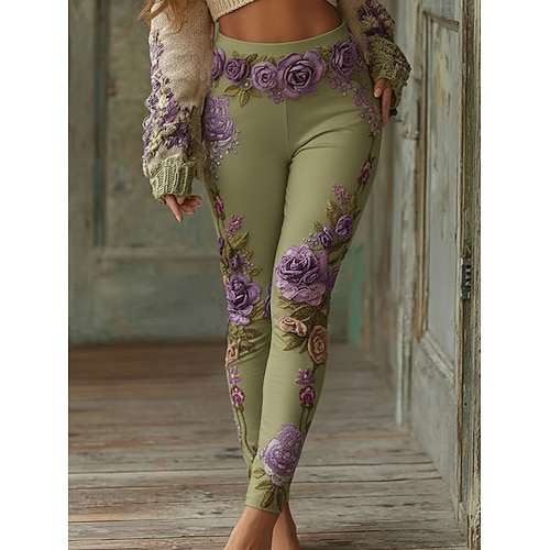 Per donna Leggings Leggings comodi Vacanza Vintage Essenziale Lunghezza intera Vita Alta Floreale Stampa Confortevole Elasticizzato Vacanza Casuale Quotidiano Verde Primavera Autunno Vestibilit