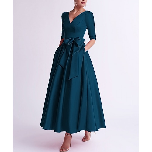 Abiti da cocktail A-Line elegante per invitata a matrimonio lungo fino al tè maniche 3/4 scollatura a V in satin con fiocco/i e tasche