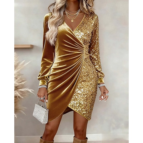 Per donna Mini Abito Abito in Velluto Abito con Paillettes Tubino Moda Caldo Moderno Quotidiano Vacanza Uscire Vestibilità regolare Semplice Manica Lunga Scollo a V Blu Nero Borgogna Oro Primavera