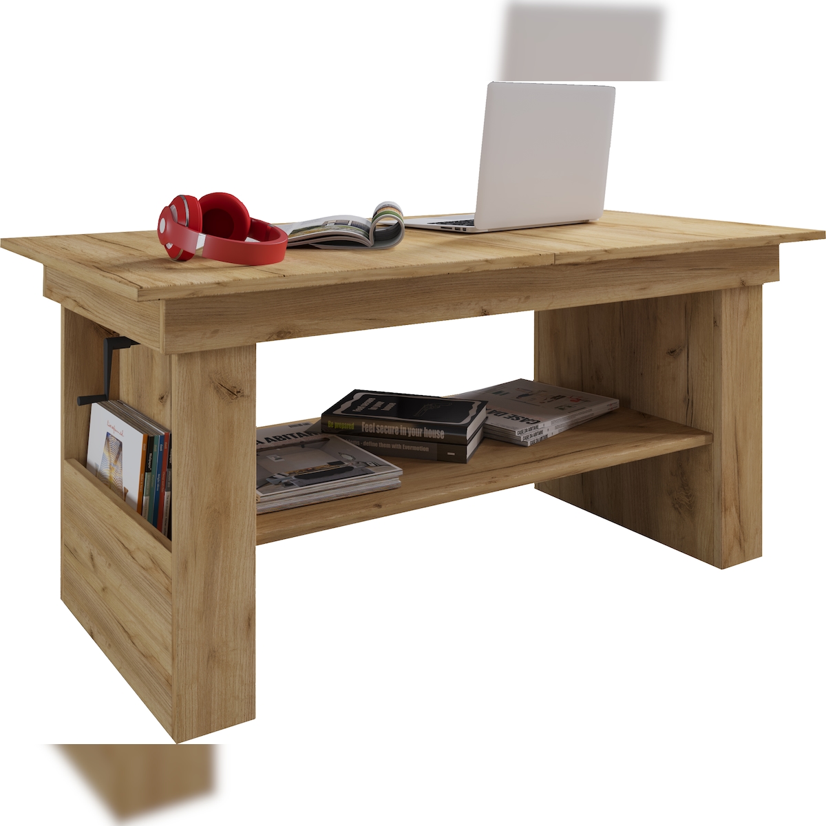 VCM Kobila Couchtisch mit höhenverstellbarer Tischplatte, 1 Regal und 2 Fächern Honig-Eiche dekor.