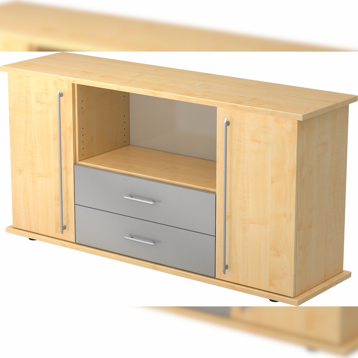 bümö Sideboard Ahorn mit Flügeltüren & Regal - Büromöbel Sideboard mit Schubladen Holz 166cm breit, 45cm schmal, Büro Schrank für Flur oder als
