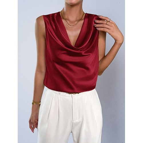 Per donna Camicia in raso Blusa Top con collo a cappuccio Maglietta senza maniche Semplice Elegante Essenziale Classico Senza Maniche Scollo a Cascata Top Regolari Quotidiano Ferie Uscire Nero Vino