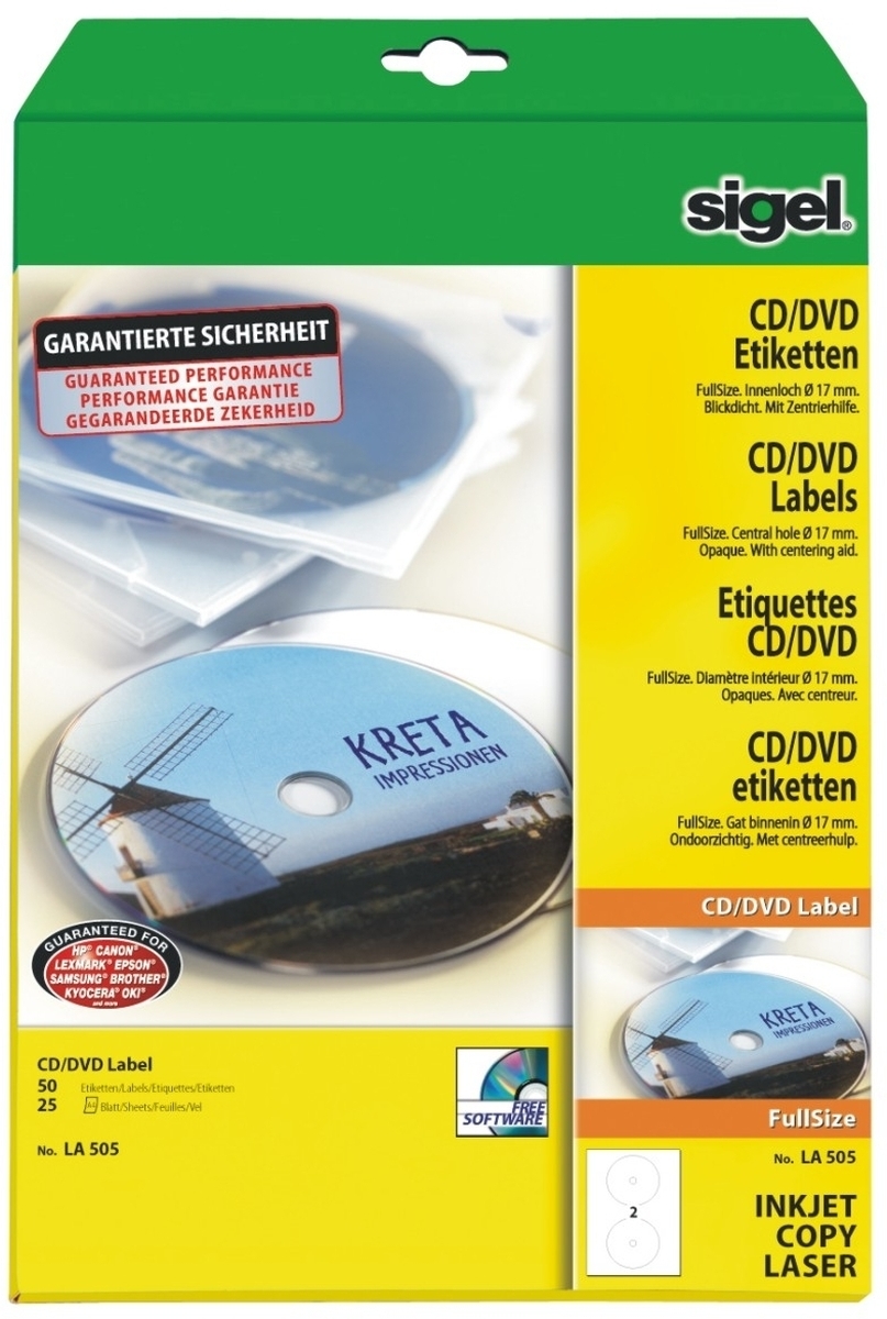 Sigel CD-/DVD-Etiketten Inkjet/Laser/Kopier 117mm VE=10x50 Stück (25 Blatt) weiß