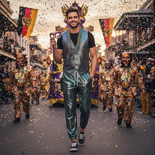 Costume di Carnevale 2026 Disco Carnevale Gilet Jogger Costume Cosplay Paillettes Adulti Per uomo Carnevale martedì grasso Giorno di San Patrizio Club Feste Performance Costume di Carnevale facile