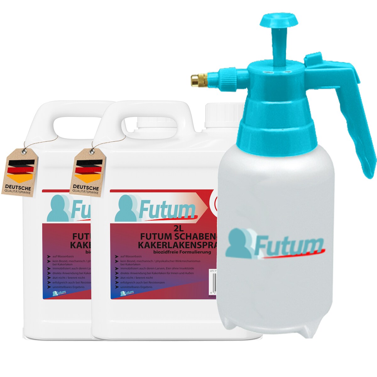 FUTUM 2x2L Schabenspray / Kakerlakenspray bekämpft Insekten, Eier, Larven ohne Biozide auf Wasserbasis, Sofortwirkung ohne Flecken + 2L Sprüher