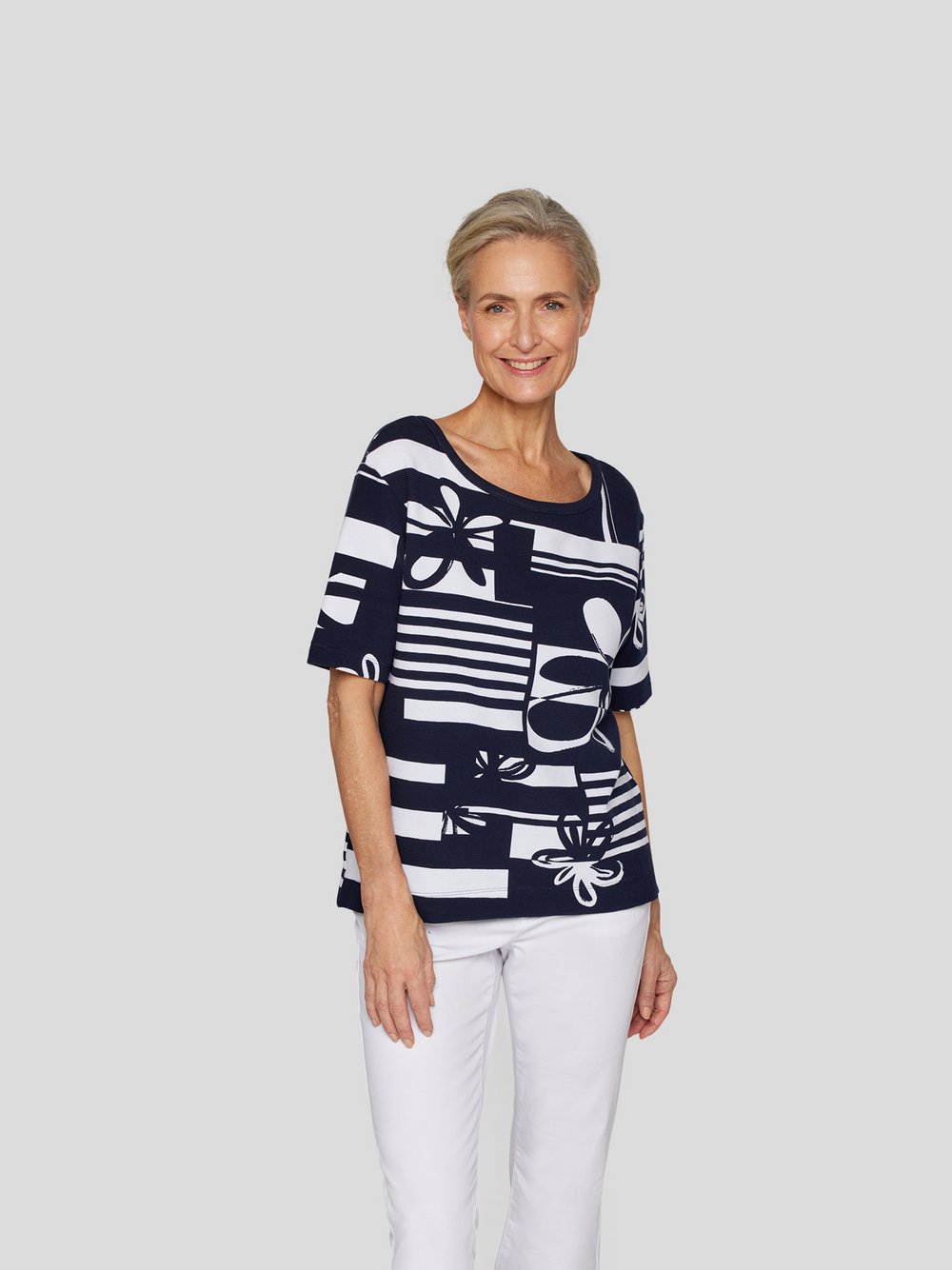 3/4-Arm-Shirt RABE, Damen, Gr. 48, blau (marine), Jersey, Obermaterial: 92% Viskose, 8% Elasthan, bedruckt, casual, tailliert hüftbedeckend, Rundhals, 3/4-Ärmel, Shirts, mit grafischem Muster