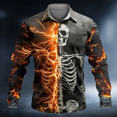 Per uomo Teschio Fulmini Scheletro Camicia Camicia con Bottoni Manica Lunga Gotico punk oscuro All'aperto Ferie Estate Primavera Collo ripiegato Stampa 3D camicie con colletto Grigio scuro