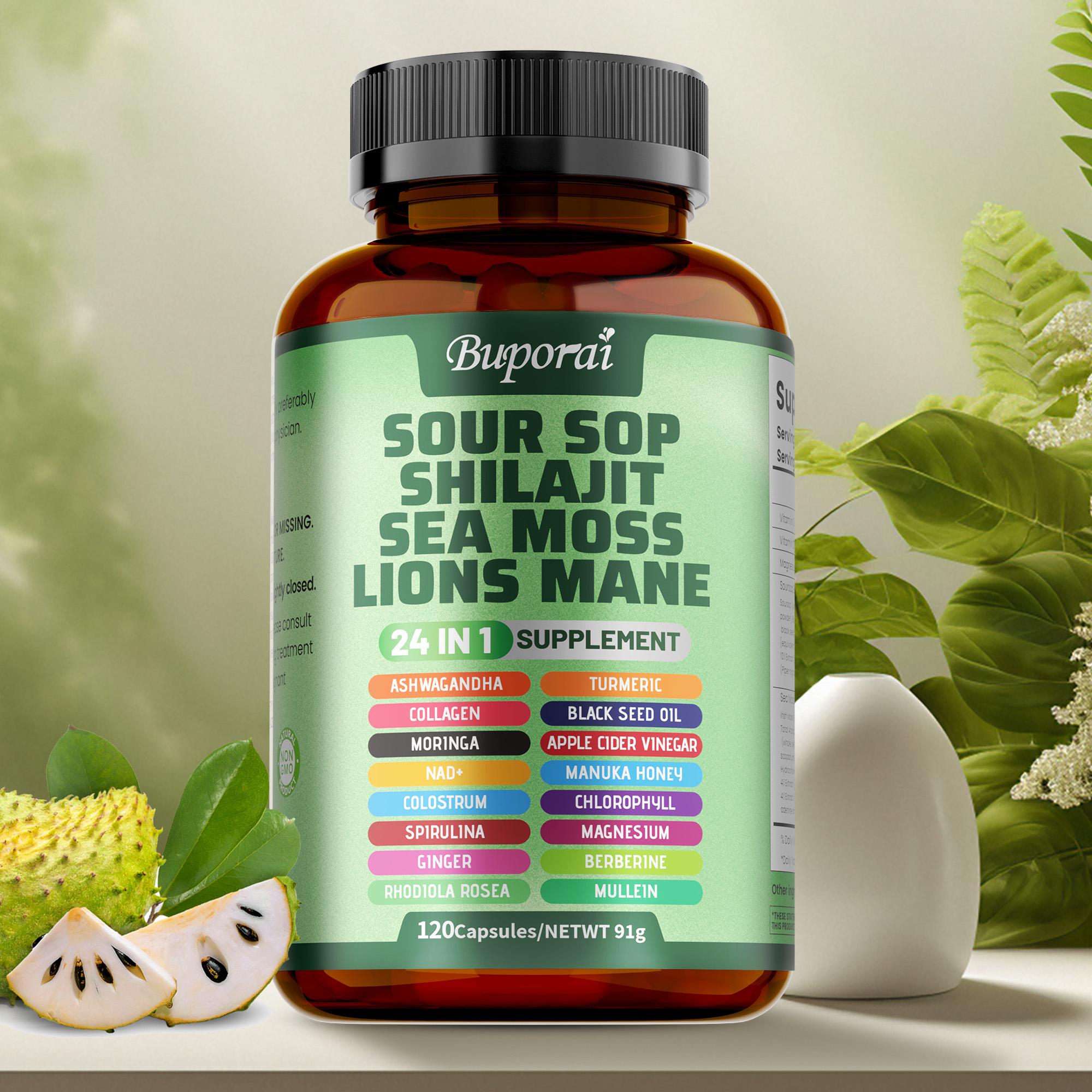 Rijk aan een mengsel van sappige zuurzak en leeuwenmanenpaddenstoel, heilzaam voor de huidgezondheid en gewrichtssterkte, geschikt voor volwassenen, v