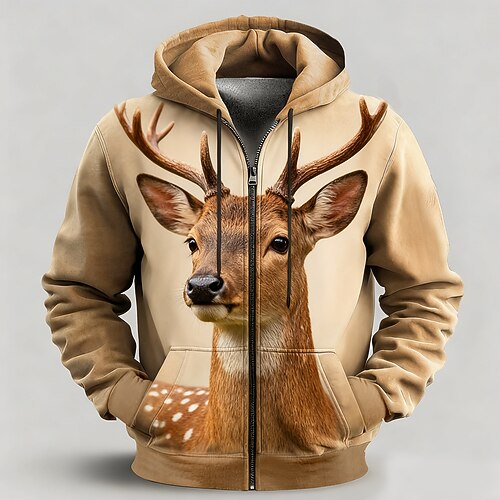 Per uomo Cervo Felpa con Cappuccio Giacca di pelle Felpa Fantasia Stampa su tutta la superficie Con cerniera Vacanza Uscire Abbigliamento casual alla moda Cachi Cerniera Autunno Inverno progettista S