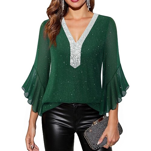 Per donna Blusa Top con paillettes Blocco di colori Elegante Moderno Manica 3/4 Manica a Campana Scollo a V Top Regolari Quotidiano Ferie Uscire Patchwork Blu Nero Rosso Viola Verde Estate Primavera