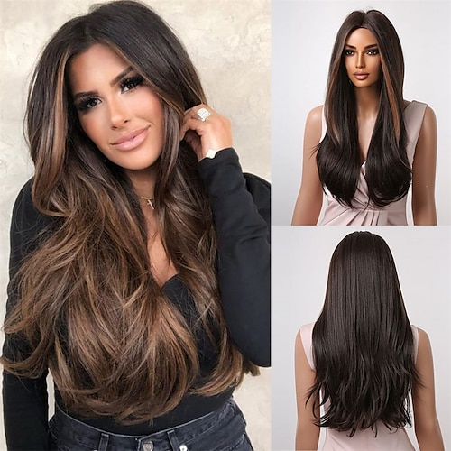 parrucche castane per donna parrucca sintetica a strati lunghi e lisci capelli naturali parte centrale