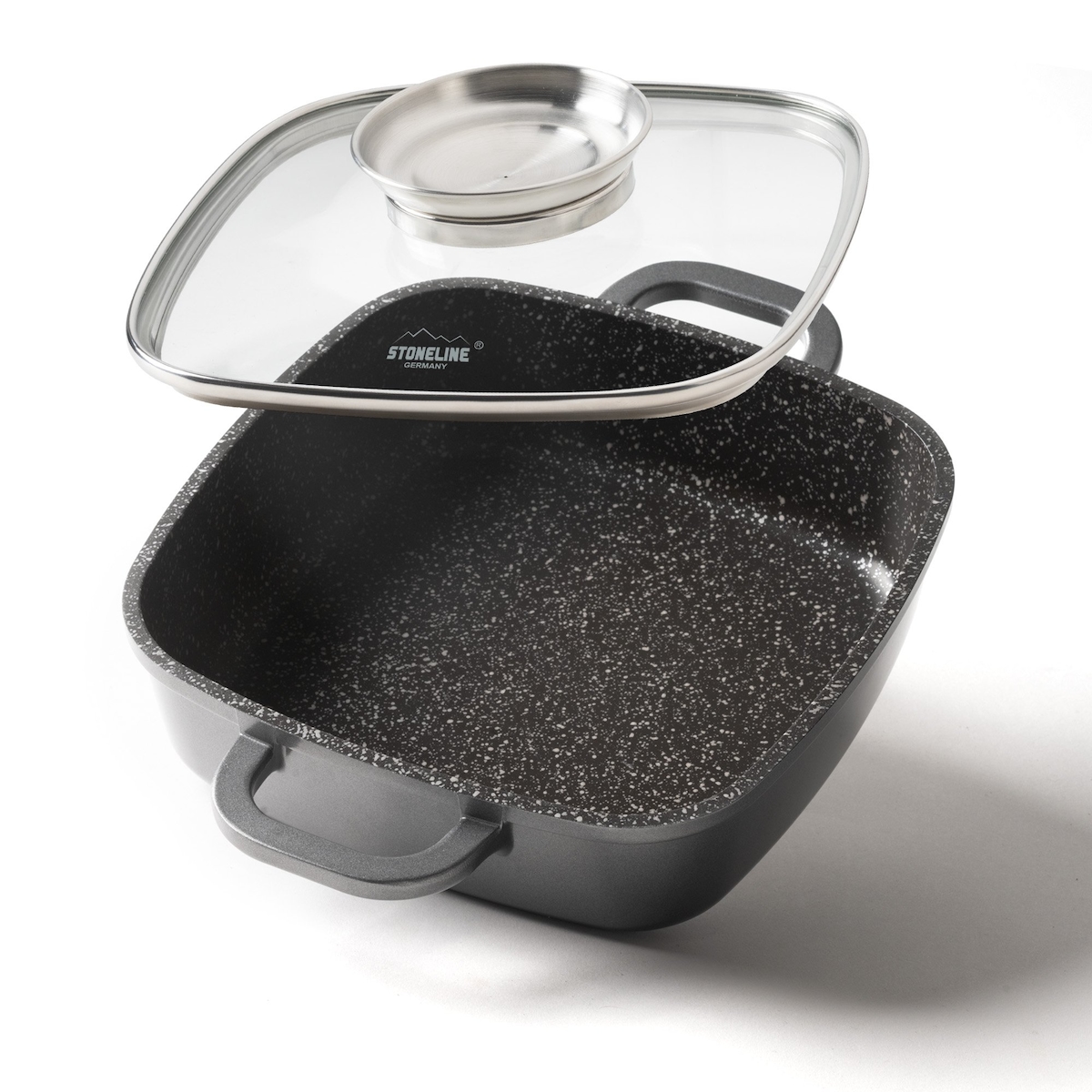 Keramiktopf-Set mit zwei Griffen: Enthält Suppentopf mit Deckel, Dampf- und Schmorzubehör sowie backofen- und mikrowellengeeignete Auflaufform.