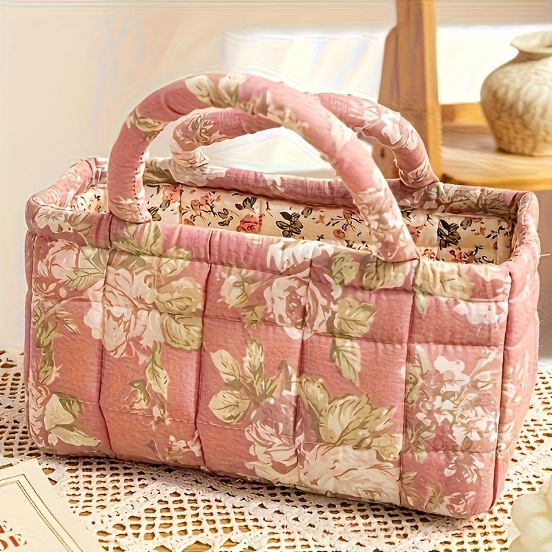 Large Vintage Floral Quilted Storage Basket with Sturdy Carry Handle - Foldable Multifunctional Organizer for Women & Girls, Portable Laundry, Toy