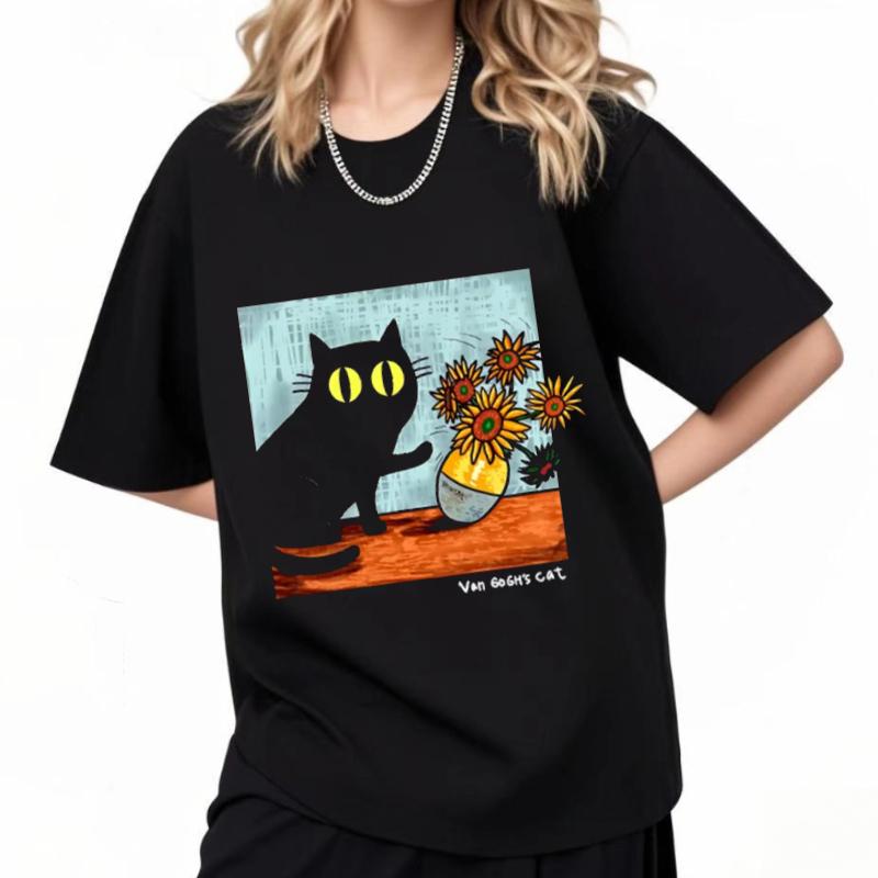 Van Gogh Cat Graphic T Shirts Men Women Flower Black Cat T-shirt Round Neck Cotton Short Sleeve Trendy Tee Shirt Streetwear cm