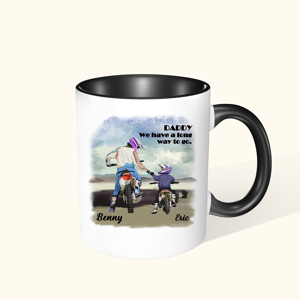 Tazza personalizzata Motorcycle Father and Kid da 11 oz con testo del nome Regalo di compleanno per la festa del papà e del bambino