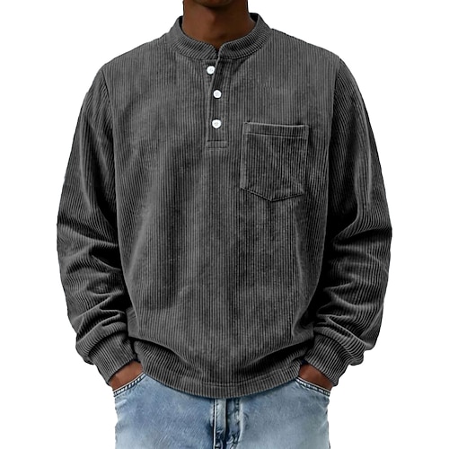 Per uomo Maglietta Camicia di Velluto a Coste Maglia Henley Manica Lunga Henley Primavera Autunno Tinta unica Vintage Streetwear Elegante Tasca Manica corta Quotidiano All'aperto Vacanza Nero Blu