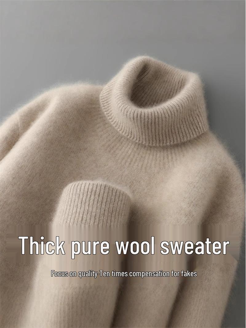 Men's High-Neck 100% Pure Wool Sweater: Thick Long-Sleeve Pullover for Autumn/Winter, Loose Fit Knitted Base Layer. cm
