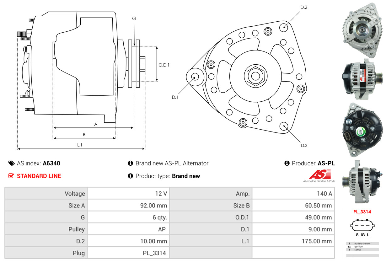 AS-PL Generator A6340 12V 140A für FORD JAGUAR 6W83-10300-AA 2W93-10300-AA 9M83-10300-AA