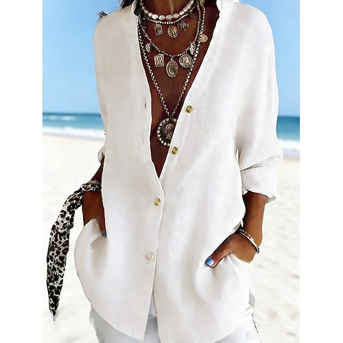 Per donna Camicia Estiva Camicia casual Blusa Bottoni Tinta unica Vacanza Tropicale Elegante Manica Lunga Collo ripiegato Colletto a Camicia Top Regolari Quotidiano Spiaggia Ferie Blu Nero Bianco