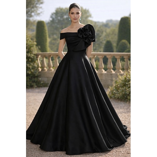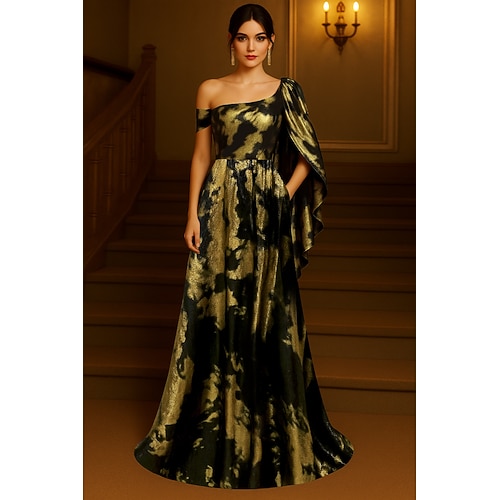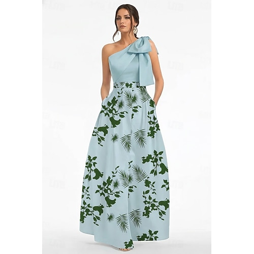 Linea ad A Lunghezza al pavimento Abito da Sera Elegante Stile Celebrità Setoso Senza Maniche Monospalla Festa in giardino Matrimonio Raso con Stampa floreale Fiocco/Fiocchi Pieghe