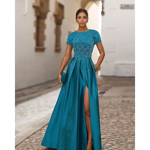 Linea ad A Lunghezza al pavimento Abito da Sera Da principessa Abito formale Elegante Vintage Scintillante Manica Corta Collo gioiello Formale Tasca Raso con Strass Glitter Spacco