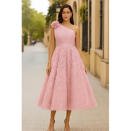 Linea ad A Lunghezza Tè Abiti da Ballo Elegante Floreale Senza Maniche Monospalla Festa in giardino Formale Tulle Senza schiena con Fiori 3D Arricciato