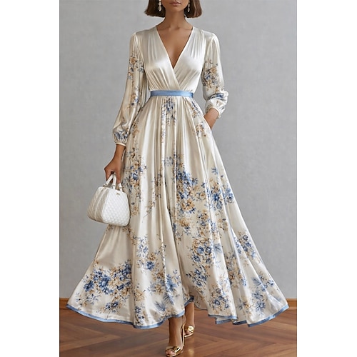 Linea ad A Lunghezza al pavimento Lunghezza alla caviglia Abiti da Cocktail Elegante Floreale Manica Lunga Scollo a V Festa in giardino Matrimonio Raso Shiena scoperta con Stampa floreale