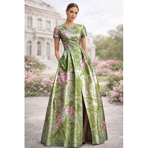 Linea ad A Lunghezza al pavimento Abito da Sera Da principessa Elegante Vintage Floreale Manica Corta Girocollo Festa in giardino Matrimonio Tasca Raso con Stampa floreale Pieghe Tasca