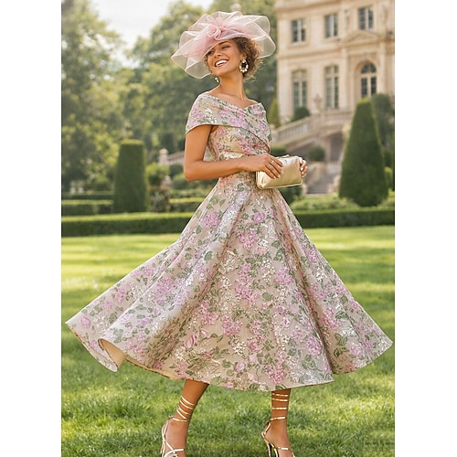 Linea ad A Lunghezza al pavimento Lunghezza Tè Abito Formale Abito Floreale Abiti da Cocktail Elegante Vintage Floreale Manica Corta Senza Spalle Festa in giardino Matrimonio Tasca Jacquard Shiena