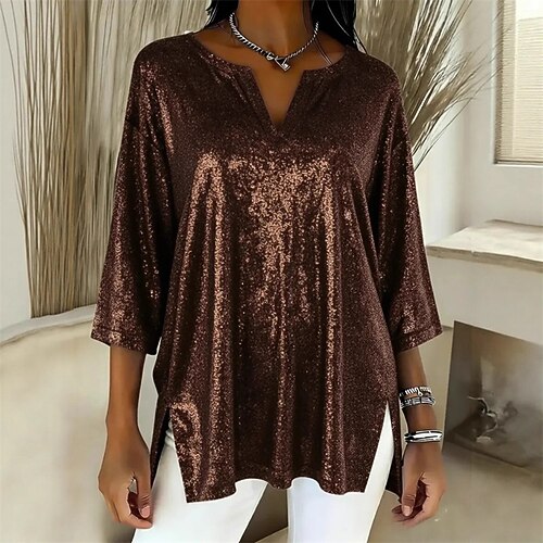 Per donna Camicia Elegant Raso/Satin Blusa Semplice Attivo Elegante Manica Lunga Scollo a V Top Regolari Ferie Uscire Paillettes Orlo asimmetrico Nero Vino Autunno Inverno