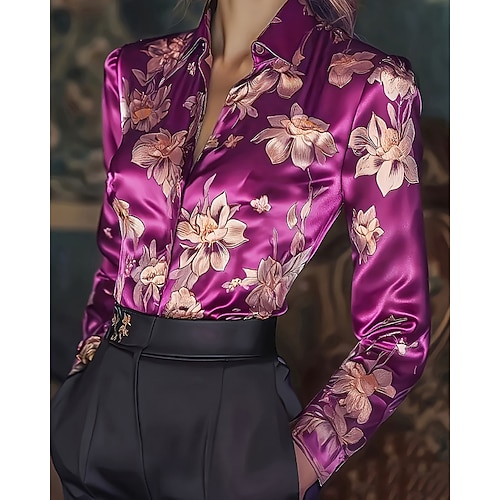 Per donna Camicia Elegant Raso/Satin Blusa Floreale Vintage Elegante Manica Lunga Colletto a Camicia Top Regolari Ferie Uscire Bottoni Stampato Vino Viola Verde Rosa Primavera Autunno