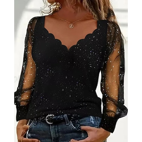 Per donna Blusa Top Eleganti Top con paillettes Tinta unica Semplice Elegante Vintage Carino Manica Lunga Girocollo Top Regolari Quotidiano Lavoro Ferie Arricciato Paillettes Patchwork Argento Nero