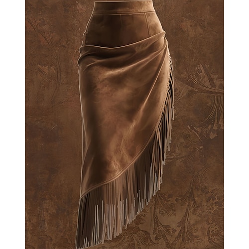 Per donna Vintage Moda Casual Asimmetrico Vita media Gonne Semplice Arricciato Frangia con nappe Inelastico Quotidiano Vacanza Marrone Estate Poliestere