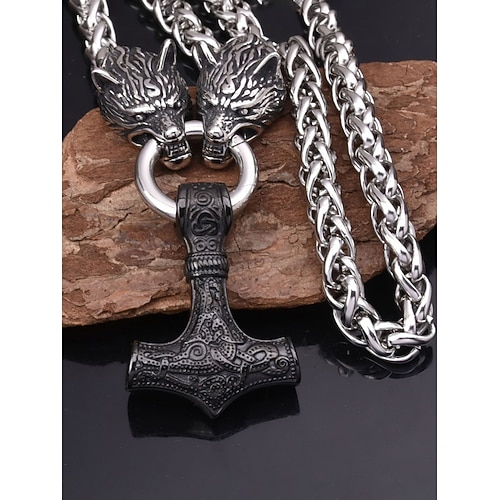 Collana con ciondolo in stile vichingo da uomo, materiale in lega con testa di lupo e design a martello di Thor, gioielli nordici unici per abbigliamento casual e da festa
