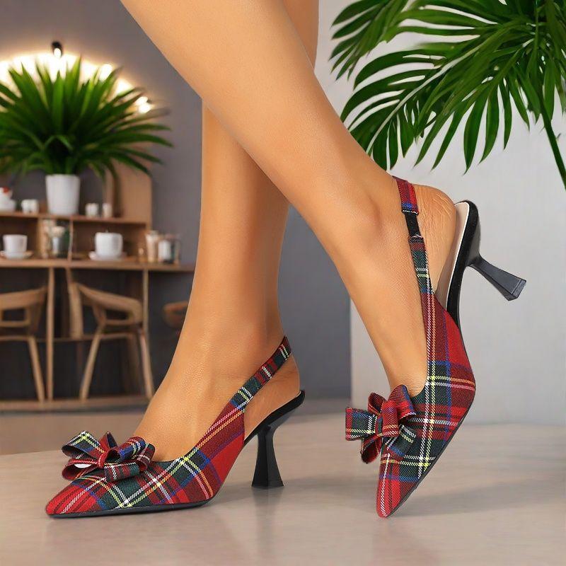 Women's Plaid Slingback Kitten Heels Closed Pointed Toe Bow Tie Slip On Work Pumps Ankle Strap Stiletto Formal Party Wedding Dress Shoes for Women cm