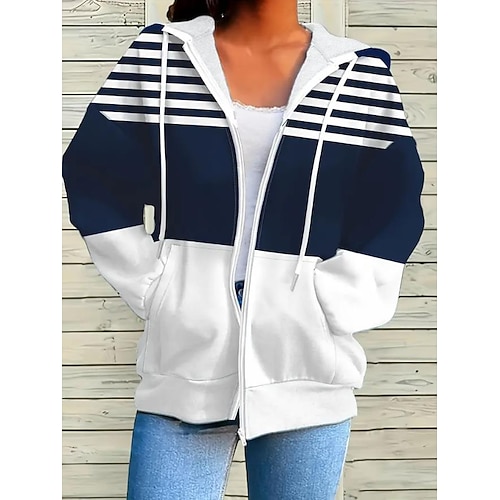 Giacca felpa con cappuccio da donna a maniche lunghe con zip e tasca leggera casual micro-elastica over size geometrica a righe attiva vintage sportiva con cordoncino e tasca frontale blu navy